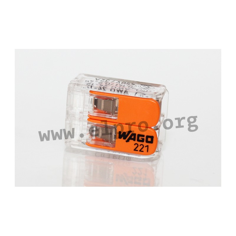 2-, 3- und 5-Leiter-Klemme für alle Leiterarten mit CAGE CLAMP® Anschlusstechnik und Push-in Betätigungshebeln. Sie haben eine seitliche Verdrahtung und sind geeignet für einen Leiterquerschnitt von 0,2 bis 6mm2 (ein-/mehrdrähtig) bzw. 0,14 bis 6mm2 (feindrähtig). Außerdem sind passende Befestigungsadapter mit (221-250_/221-251_) und ohne Zugentlastung (221-252_/221-253_) erhältlich. Wir bieten diverse Ausführungen dieser Wago Serie an.