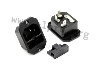 IEC appliance inlets (C14) in black with a fuse holder for a fuse link (5x20mm) and a tab terminal. They are suitable for screw mounting with longitudinal (42 R32 1_ / 36mm hole distance) or transversal flanges (42 R32 2_ / 39mm hole distance). We offer various types of this K+B series.