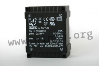 Flat transformers with 3 to 6VA and a UI30 core. These transformers are vacuum encapsulated, have a two chamber winding and at least 10mm sparking/leakage distance in the air. They 100% tested at 6000V between primary as well as secondary winding and are suitable for PCB mounting as well as for 115/230V power supplies. We offer various types of this Hahn series.