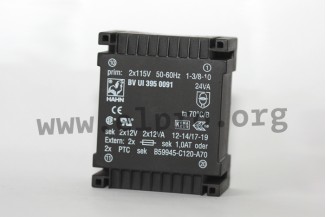 Vacuum encapsulated flat transformers with 24VA, a UI 39 core and a two chamber winding. These transformers have a sparking/leakage distance of at least 10mm and are routine-tested with 6000V between primary and secondary winding. They are not short circuit proof and are suitable for PCB mounting as well as for 115/230V power supplies. We offer the following types of this Hahn series: BV UI 395 0098, BV UI 395 0091 and BV UI 395 0083.