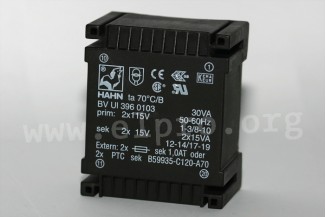 Vacuum encapsulated flat transformers with 30VA, a UI39 core and a two chamber winding. These transformers are fully tested with 6000V between primary/secondary winding and have at least 10mm leakage/sparking distance in air. They are suitable for PCB mounting as well as for 115/230V power supplies and are not short circuit proof. We offer the following types of this Hahn series: BV UI 396 0102, BV UI 396 0079 and BV UI 396 0103.