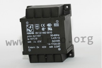 Vacuum encapsulated flat transformers with 60VA, a two chamber winding and a UI 48 core. These transformers are suitable for PCB mounting as well as for 115/230V power supplies and have a leakage and sparking distance in air of at least 10mm. They are fully tested with 6000V between primary and secondary winding and comply with EN61558 as well as VDE 0570. We offer the following types of this Hahn series: BV UI 482 0009 and BV UI 482 0010.