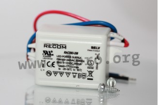 LED drivers in a plastic housing (IP66) with 3W, a constant current, a universal input and protection class II. These devices are suitable for LED lighting applications and are protected against overload, overvoltage as well as short circuit. They are not dimmable and comply with EN55015, UL8750, UL1310, IEC61347-2-13, EN61347-2-13, IEC61347-1 as well as EN61347-1. We offer the following types of this Recom series: RACD03-350 and RACD03-700.