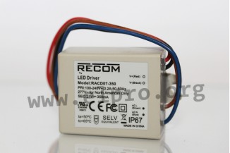 LED drivers in a plastic housing (IP67) with 7W, a constant current, protection class II and a universal input. These devices are suitable for LED lighting applications and are protected against overload (through current limiting), overvoltage as well as short circuit. They are not dimmable and comply with UL8750, UL1310, EN55015, EN61347-1, EN61347-2-13, IEC61347-2-13 as well as IEC61347-1. We offer the following types of this Recom series: RACD07-350 and RACD07-700.