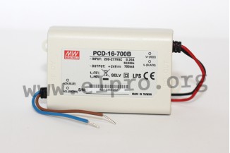 LED drivers in a plastic housing (IP42) with AC dimming, a constant current, a stranded wire connection and 16W. These devices are protected against overtemperature, overload (auto recovery) as well as short circuit and comply with EN61000-3-2, Class C, EN55015, EN61347-1 as well as EN61347-2-13. They have a built-in active PFC function and are suitable for phase-cut and phase-angle dimmers as well as for LED lighting applications. We offer the following types of this Mean Well series: PCD-16-350B, PCD-16-700B, PCD-16-1050B and PCD-16-1400B.