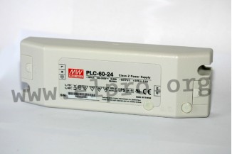 LED drivers in a plastic housing with a constant current / constant voltage (mixed mode), 60W and a screw terminal. These flickerfree devices comply with UL1310 class 2, EN61000-3-2 class C, EN55015, EN61347-1 as well as EN61347-2-13 and are protected against overload (auto recovery), overvoltage as well as short circuit. They have a built-in active PFC function and are suitable for LED lighting applications. We offer the following types of this Mean Well series: PLC-60-12, PLC-60-15, PLC-60-20, PLC-60-24, PLC-60-27, PLC-60-36 and PLC-60-48.