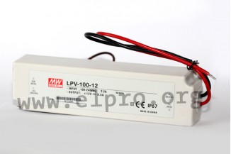 LED drivers in a plastic housing (IP67) with a universal input, 100W and a constant voltage. These devices are protected against short circuit, overvoltage as well as overload (auto recovery) and comply with UL8750, EN62368-1, IEC62368-1 as well as EN55032 class B. They are suitable for LED lighting applications and are not dimmable. We offer the following types of this Mean Well series: LPV-100-5, LPV-100-12, LPV-100-15, LPV-100-24, LPV-100-36 and LPV-100-48.