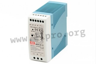 Switching power supplies with 40W, a universal input, an LED indicator for power on, a DC OK relay contact, a low no-load power and screw terminals (touch guard). These devices are suitable for DIN rail mounting and are protected against overload (auto recovery), overvoltage as well as short circuit. They have a fanless design and comply with UL/EN62368-1, EN55032 class B, EN61204-3 class B, EN61000-3-2 as well as EN61000-3-3. We offer the following types of this Mean Well series: MDR-40-5, MDR-40-12, MDR-40-24 and MDR-40-48.