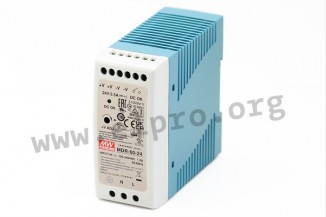 Switching power supplies with 60W, a universal input, an LED indicator for power on, a DC OK relay contact, a low no-load power and screw terminals (touch guard). These devices are suitable for DIN rail mounting and are protected against overload (auto recovery), overvoltage as well as short circuit. They have a fanless design and comply with UL/EN62368-1, EN55032, EN61204-3 class B, EN61000-3-2 as well as EN61000-3-3. We offer the following types of this Mean Well series: MDR-60-5, MDR-60-12, MDR-60-24 and MDR-60-48.
