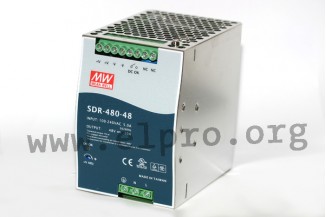 Switching power supplies in a DIN rail housing with 480W, an LED indicator for power on, a built-in DC OK relay contact, a universal input and screw terminals (touch guard). These devices have a built-in active PFC function and are protected against overload (auto recovery), overvoltage as well as short circuit. They have a fanless design and comply with EN61000-6-2, EN50082-2, EN62368-1, EN55032 class B, EN61204-3 class B, EN61000-3-2 as well as EN61000-3-3. We offer the following types of this Mean Well series: SDR-480-24 and SDR-480-48.