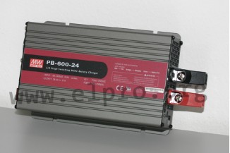 Battery chargers with 600W, a universal input, a 2/3/8 stage charging curve (selectable by switch), a built-in remote ON/OFF control, a fan and a tricoloured LED indicator. These devices are suitable for lead-acid as well as Li-ion batteries and comply with EN60335-1, EN60335-2-29, EN62368-1, EN55032 class B, EN61000-3-2 as well as EN61000-3-3. They have a built-in active PFC function, a built-in temperature compensation function and are protected against overvoltage, overtemperature, short circuit as well as reverse current. We offer the following types of this Mean Well series: PB-600-12, PB-600-24 and PB-600-48.
