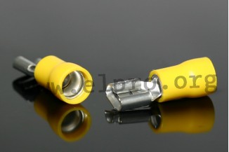 Flat receptables with a coloured insulation and a width of 2,8, 4,8 or 6,3mm for crimping or soldering as well as tinned multiconnectors from manufacturers such as Vogt and FCI (Amphenol).