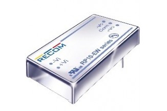 These converter modules in 2x1-housing are suitable for direct PCB mounting. Their input voltage ratio is 4:1 and the isolation voltage is 1.6kV AC. The devices have a fixed operating frequency and they a six-sides continuous shield. We are offering the following article by Recom: RP10-2405SEW.