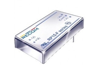 These converter modules with 2x1 housing are suitable for direct PCB mounting. The input voltage ratio is 2:1 and the isolation voltage is 1.6kV AC and they are equipped with a six-sides continuous shield. Furthermore, they are characterized by a fixed operating frequency. We are offering the following article by Recom: RP15-2405SF.