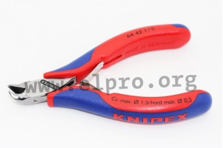 Precision pliers suitable for ultra fine cutting work in electronics and fine mechanics. The sturdy, zero backlash box joint and a low-friction double spring ensure a gentle and even opening. The cutting edges made of a forged and multi stage oil-hardened high-grade special tool steel are additionally induction hardened (min. 56HRC) and the handles have multi-component grips. The polish in conjunction with a fine film of oil offers an effective rust protection. There are no circuit faults caused by peeling chrome from plated tools. The ESD versions have electrically discharging handles (dissipative) handles and meet standards IEC TR 61340-5 and DIN EN 61340-5. We are offering the following types by Knipex: 64 02 115, 64 12 115, 64 42 115, 64 62 120, 64 12 115 ESD and 64 62 120 ESD.