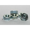 Hex nuts, plain washers and external tooth lock washers made of tin-plated steel with a size of M2,5, M3 and M4 from manufacturers such as Würth. Delivered in packages of 100 or 1000 pieces.