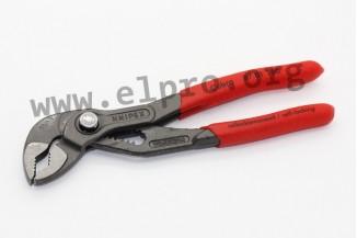 Oil-hardened water pump pliers forged from chrome-vanadium electric steel with high load capacity, a good lever action for optimal power transmission and a secure catching of the hinge bolt (no unintentional adjustment). These tools can be adjusted precisely to different sized workpieces at the touch of a button and have a box-joint design to guarantee high stability due to a double guide. They are wear resistant because of their gripping surfaces with special hardened teeth and self-locking on pipes and nuts which allows a power-saving operation and prevents a slipping off the workpiece. We offer these pliers by Knipex in different designs: 87 01 125 (Mini Cobra® for fine mechanical applications, length 125mm, weight 85g, suited for pipes up to 27mm), 87 01 150 (length150mm, weight 135g, suited for pipes up to 32mm), 87 01 180 (length 180mm, weight 160g, suited for pipes up to 42mm), 87 01 250 (30% expanded gripping capacity, length 250mm, weight 335g, suited for pipes up to 50mm). Furthermore, the following sets of spare parts: 87 09 150 and 87 09 180.