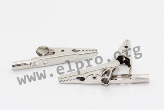 Crocodile clips with a socket terminal (Ø4mm). These clips grip up to Ø8mm and are suited for a rated current of 10A (AK 4732 Cu) or 16A (AK 305 Ni) with a rated voltage of 33V AC or 70V DC. They have no insulation.