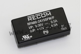 DC/DC converters in a compact 2x1 inch housing with single output and an impressive power rating of up to 60W. These devices feature a versatile input voltage ratio of 4:1, making them suitable for various applications. They are designed to be highly reliable and durable, offering protection against overload, overvoltage and short circuit conditions that may arise during operation. Additionally, they do not require any minimum load which makes them even more convenient for use across different systems. The RPA60-_/P model comes with positive CTRL logic while the RPA60-_/N has negative CTRL logic - providing flexibility in terms of system integration options. We offer the following types of this Recom series: RPA60-2412SFW/P, RPA60-2415SFW/P, RPA60-2424SFW/P, RPA60-2412SFW/N, and RPA60-2424SFW/N.
