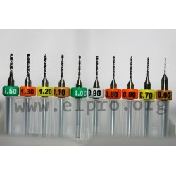 Assortment with 10 drill bits: 0,6mm; 0,7mm; 2x0,8mm; 0,9mm; 1,0mm; 1,1mm; 1,2mm; 1,3mm and 1,5mm.