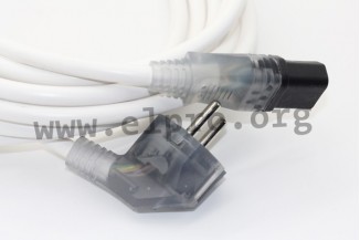 PVC power supply cables in white, with a moulded angle plug with earthing contact (16A/250V, IEC884-1/DIN 49441 R2) and a straight C13 appliance connector (10A/250V, EN60320-1). They are suitable for medical ...