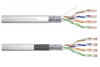 PVC twisted pair cables in grey. These Cat. 5e data cables are suitable for the installation of cable lines of class D (100MHz) and have a PVC outer jacket. They have the colour code blue-white/orange-white/green-white/brown-white and comply with ISO/IEC 11801, DIN EN 50173 as well as DIN EN 50288-2-1. We offer the following types of this Digitus series: CAT 5e F-UTP, CAT 5e SF-UTP, and DK-1511-V-305-1.