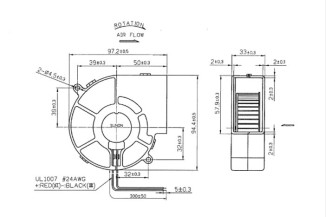DC 97x94x33mm fans with an voltage output of 12V, a electronic DC motor, as well as it's impeller and frame are made of filled Thermoplast PBT (UL94V-0). Connection is via stranded and isolated wires AWG24 to ensure easy installation.