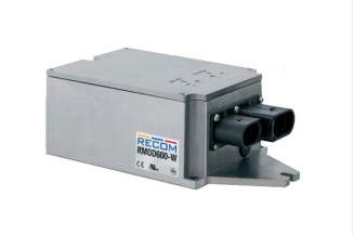 DC/DC converters in a 8"x4,53" housing, with a high power density, chassis mounting, and ground plate cooling. These devices function in parallel usage, and are woter and dust proof (IP69K). They are protected against over load,over temperature, and short circuit. We offer the RMOD600-60-24SW type of this Recom series.