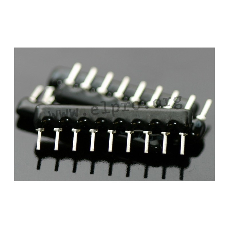 10184 NW 09-1 5,6 k NW 09-1 5,6 k resistor networks. • with 8 resistors and 9 pins• power: 0.125W• tolerance: ±5%• single inline (SIL) housing • operating voltage Umax.: 100V• operating temperature range: -55...+125°C• compact size• high stability