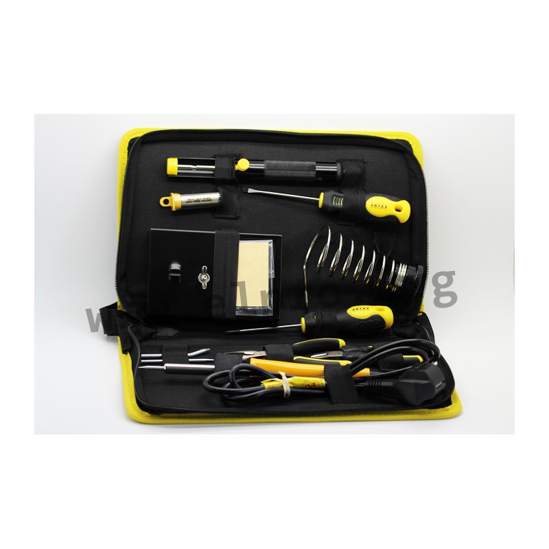 112502ER30 Toolkit KB83SZVKB83SZVAntex toolkits with soldering iron. Kit contents: pair of mini cutterspair of mini pliers2 screwdrivers (flat blade and cross)tape measure 2m auto-lock bladehex allen key set 1,5 to 6mmdesoldering pump2m tube of lead-free solderflat pack metal soldering iron standcarrying bag 285x180x50mmsoldering iron ER30 (technical specifications see table) with 2 spare soldering bits 0,5mm straight and 0,5mm angled
