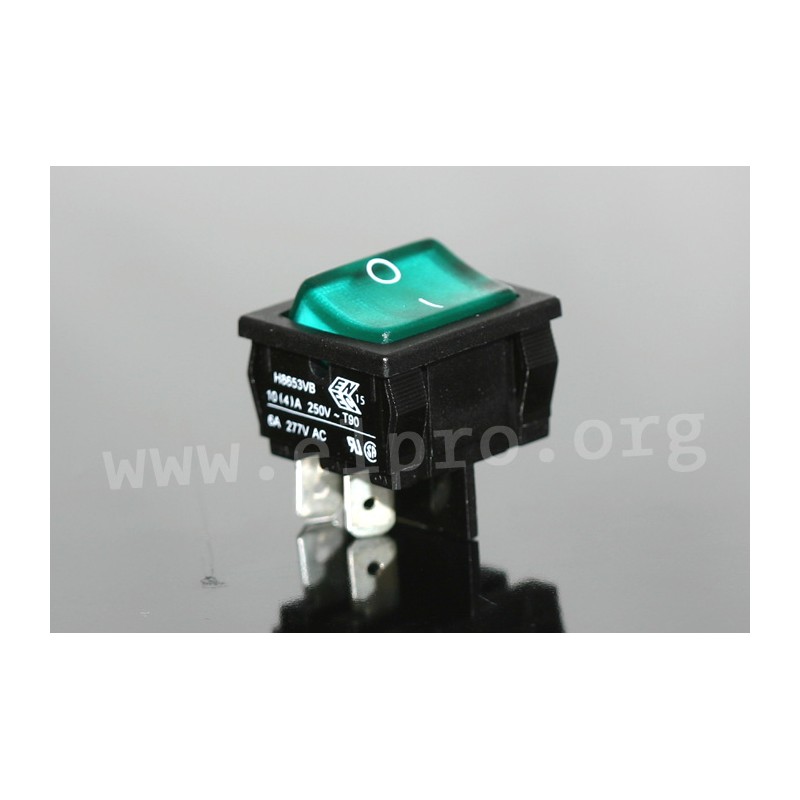 13364 WNX 13 H8653VBNBP H8653VBNBP for 22x19mm panel cutouts. * 2-pole version* with connector 4.8x0.8mm* operating voltage, max.: 250V AC* switching current, max.: 10A* switching current at inductive load, max.: 4A* inrush current (EN61058-1): 25A* insulation resistance: &gt;20MΩ* contact resistance (New State, 12V DC/1A): &lt;100mΩ* contact opening width: &lt;3mm* soldering conditions (hand soldering): 350°C/6s* materialsshell and rocker: nylon 6.6illuminated rocker: polycarbonate* current-carrying part: Cu alloy* contacts: silver-plated* flammability class: UL94V2suitable protective caps: WNX 16