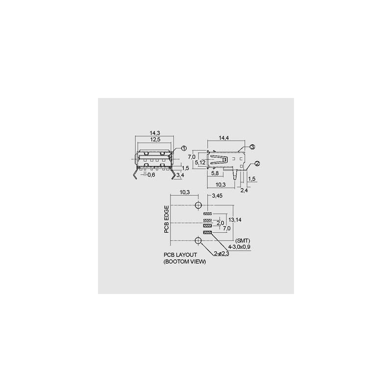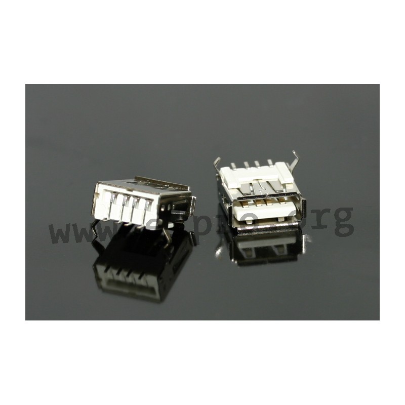 • USB A SMD: USB A sockets for PCB mounting• SMT version• 90° angled• inulator: nylon, PA9T• contacts: phosphor bronze• rated current: 1.5A• dielectric strength, 1 min.: 500V AC• insulation resistance: >1000MΩ