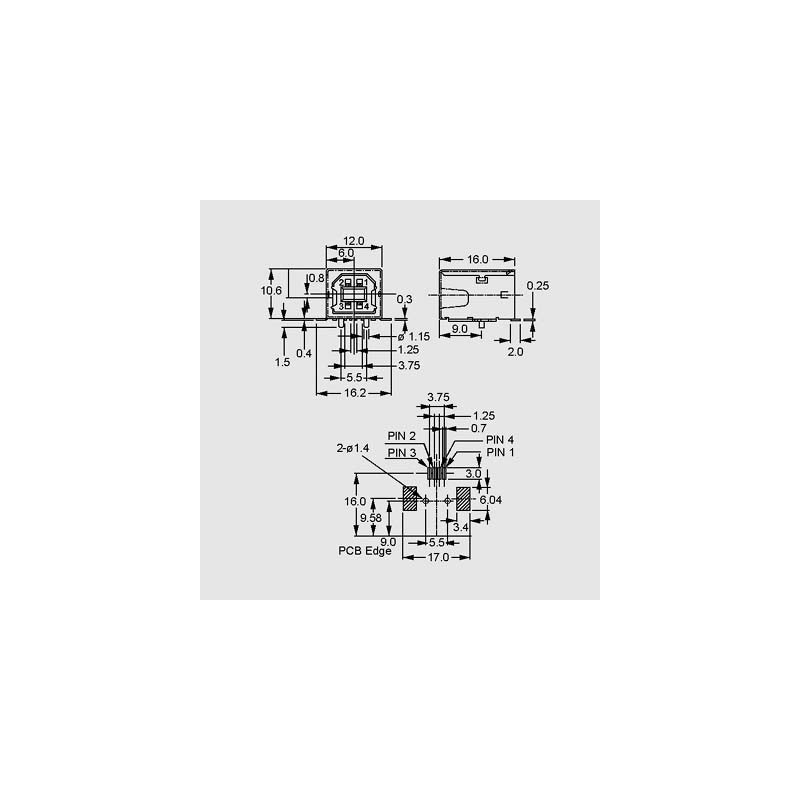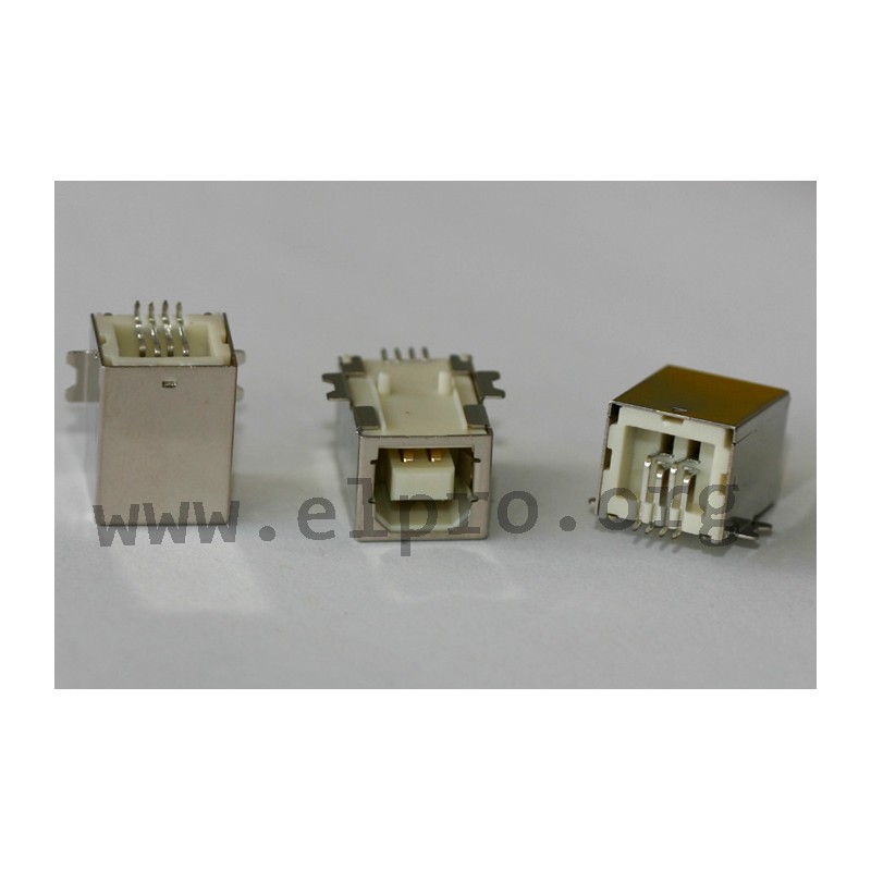 • USB B SMD: USB B sockets for PCB mounting• SMT version• 90° angled• inulator: nylon, PA9T• contacts: phosphor bronze• rated current: 1.5A• dielectric strength, 1 min.: 500V AC• insulation resistance: >1000MΩ