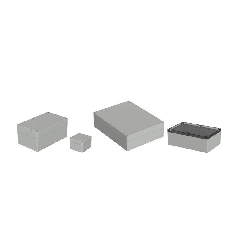 Light grey universal enclosures made of polycarbonate with a sealing and a screwed cover. These enclosures are outdoor-compatible, suitable for wall mounting and meet protection class IP65 resp. IP66. They are suitable for mounting printed circuit boards and comply with IEC62262 (tested to IK 07). We offer various types of this BOX4U series.