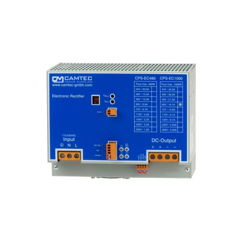 Battery chargers with 1008W, an ajustable output voltage, a remote controle, a remote sense, and an DC-OK signal. These devices are protected against overload, over voltage, overtemperature and short circuit. We offer the following types of this Camtec series: CPS-EC1000.024(R2), CPS-EC1000.036(R2), CPS-EC1000.048(R2), CPS-EC1000.060(R2), CPS-EC1000.072(R2), CPS-EC1000.110(R2), CPS-EC1000.150(R2), CPS-EC1000.220(R2), and CPS-EC1000.400(R2).