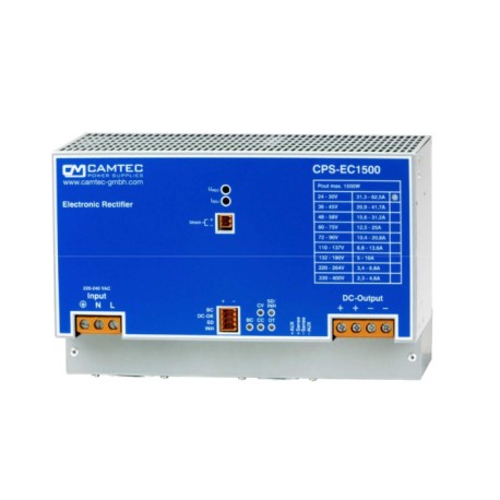 Battery chargers with 1500W, an ajustable output voltage, a remote controle, a remote sense, and an DC-OK signal. These devices are protected against overload, over voltage, overtemperature and short circuit, as well as they comply with EN 61010-1, EN 62368-1, EN 60950-1, EN 60204-1, EN 55032 class A and class B. We offer the following types of this Camtec series: CPS-EC1500.024, CPS-EC1500.036, CPS-EC1500.048, CPS-EC1500.060, CPS-EC1500.072, CPS-EC1500.110, CPS-EC1500.150, CPS-EC1500.220, and CPS-EC1500.400.