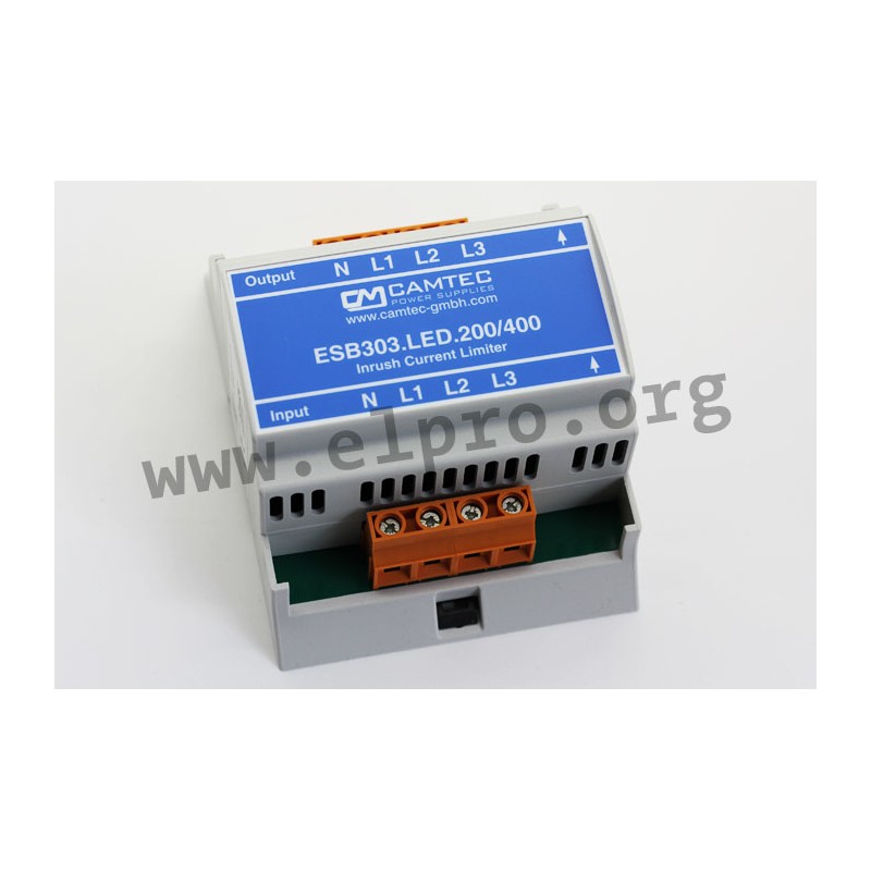Single- (ESB101_/ESB201_) resp. three-phase (ESB303_) peak / RMS current limiters in a plastic housing (IP20/UL94V-0) for capacitive loads (1000µF to 10.000µF). These devices have an integrated bypass relay as well as a built-in temperature monitoring and comply with EN60950-1, EN61010-1, EN62368-1 as well as EN55032. We offer various types of this Camtec series.