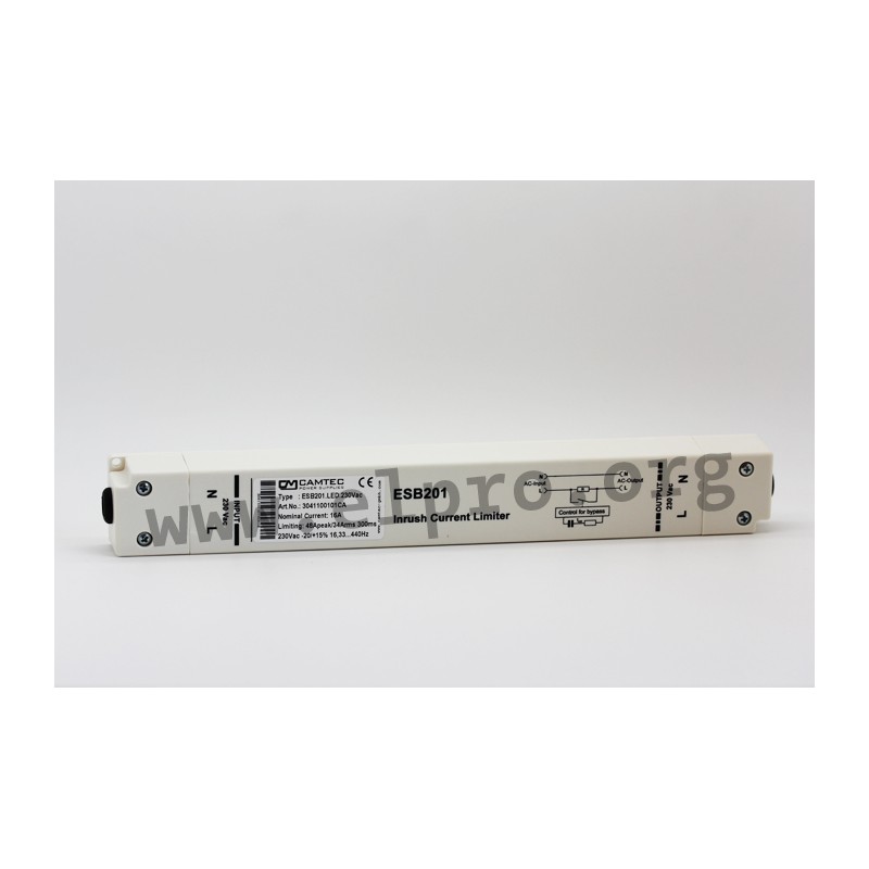 Single- (ESB101_/ESB201_) resp. three-phase (ESB303_) peak / RMS current limiters in a plastic housing (IP20/UL94V-0) for capacitive loads (1000µF to 10.000µF). These devices have an integrated bypass relay as well as a built-in temperature monitoring and comply with EN60950-1, EN61010-1, EN62368-1 as well as EN55032. We offer various types of this Camtec series.
