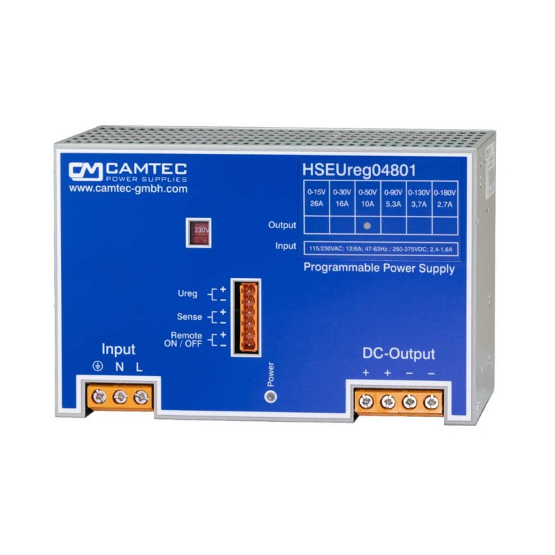 Switching power supplies in a metal housing (IP20) with 480W, a parallel function, protection class I, a remote ON/OFF control and a remote sense function. These devices are suitable for DIN rail mounting and are protected against overload, overtemperature, short circuit as well as overvoltage. They have a programmable output voltage and comply with EN61010-1, EN62368-1, EN60950-1 as well as EN55032 class B. We offer the following types of this Camtec series: HSEUREG04801.015(R2), HSEUREG04801.030(R2), HSEUREG04801.050(R2), HSEUREG04801.090(R2), HSEUREG04801.130(R2) and HSEUREG04801.180(R2).