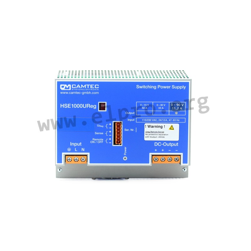 Switching power supplies in a metal housing (IP20) with 1000W, a parallel function, a remote sense function, protection class I and a remote ON/OFF control. These devices have a programmable output voltage as well as a selectable input voltage and are protected against overload, overtemperature, short circuit as well as overvoltage. They are suitable for DIN rail mounting and comply with EN61010-1, EN62368-1, EN60950-1 as well as EN55032 class B. We offer the following types of this Camtec series: HSEUREG10001.015(R2), HSEUREG10001.030(R2), HSEUREG10001.050(R2), HSEUREG10001.090(R2), HSEUREG10001.130(R2) and HSEUREG10001.180(R2).