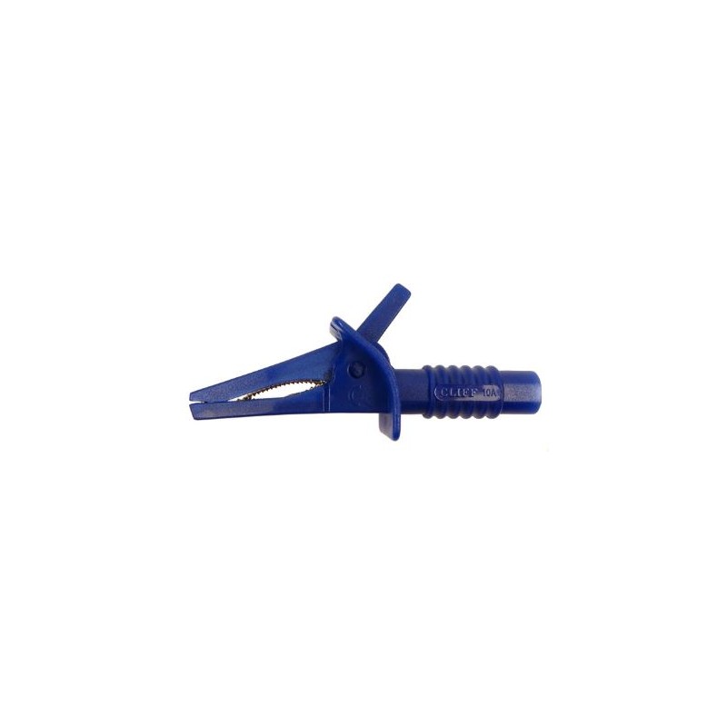 112312 FCR7943 FCR7943 Cliff safety alligator clip series FCR79. Insulated safety alligator clips with socket terminal (Ø 4mm). These clips with a rated voltage of 600V/1000V are in compliance with EN61010. Their jaws open to 25mm. We offer these safety alligator clips in black (FCR7940), red (FCR7941), green (FCR7942) and blue (FCR7943).
