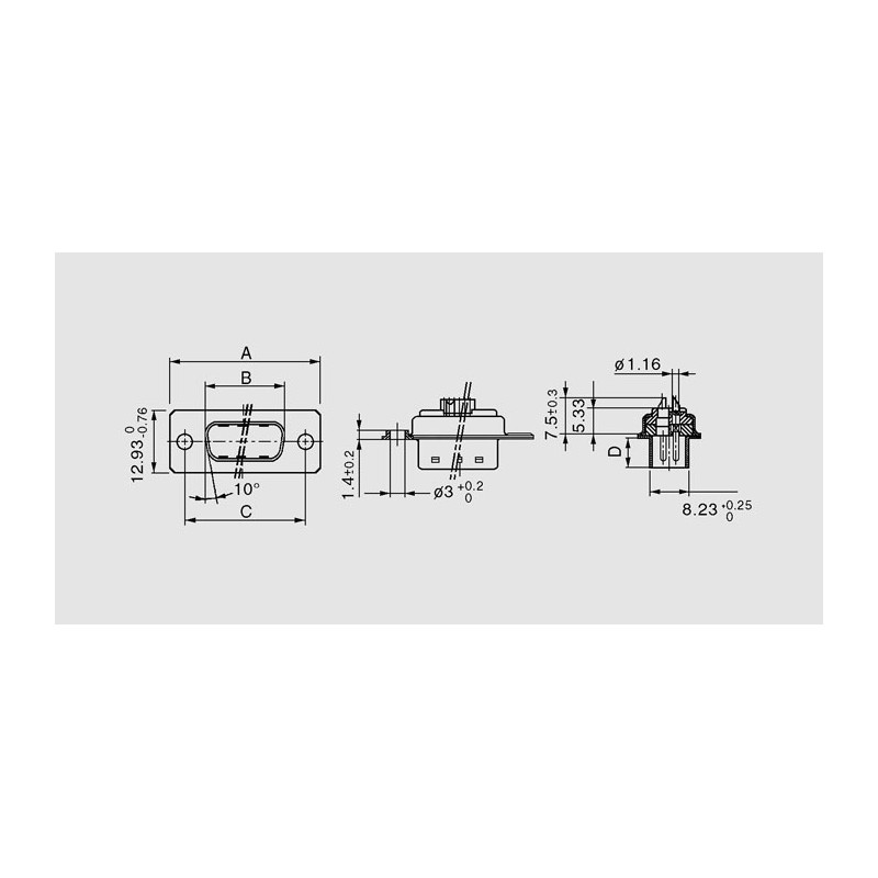 28189 DS 00+3 L 3003W3PXX99A10X 3003W3PXX99A10X Combi D-Sub plugs. • combination D-Sub plug connector for various applications• within the D-Sub plug connector there are indented holes for special contacts such as signal, high current and coaxial contacts• insulating shell: PBTP, Glass-filled, UL94V-0• contacts: Cu-alloy• contact surface: gold over nickel• housing frame: steel, tin-plated• operating temperature range: -55...+125°C• dimensions: A=39.52mm, B=25.12mm, C=33.3mm, D=6.12mm
