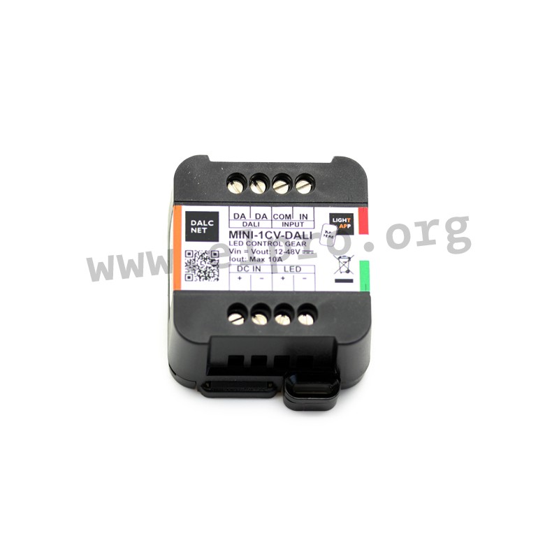 PWM dimming controllers in a plastic housing (IP20) with 576W, a constant voltage (CV), a push-dimm function, a logarithmic or linear dimming curve (0,1 to 100%), fading and soft power on/off. These flickerfree devices are suitable for LED switching power supplies, have an adjustable PWM frequency from 30 to 4000Hz and can be configured through IOS as well as Android compatible apps. They are available with a Casambi (MINI-1CV-CASAMBI) or DALI interface (MINI-1CV-DALI) and comply with EN61347-1, EN61347-2-13 as well as EN55015. We offer the following types of this Dalcnet series: MINI-1CV, MINI-1CV-DALI and MINI-1CV-CASAMBI.