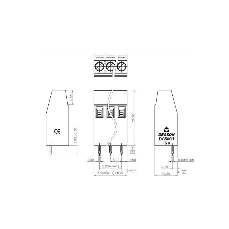 Terminal blocks with 24A and a screw principle with wire guard. These clamps have a side wire entry and a pitch of 5mm. They are green and suitable for various applications. We offer the following types of this Degson series: DG500H-5.0-25A-02P-14-00AH and DG500H-5.0-25A-03P-14-00AH.