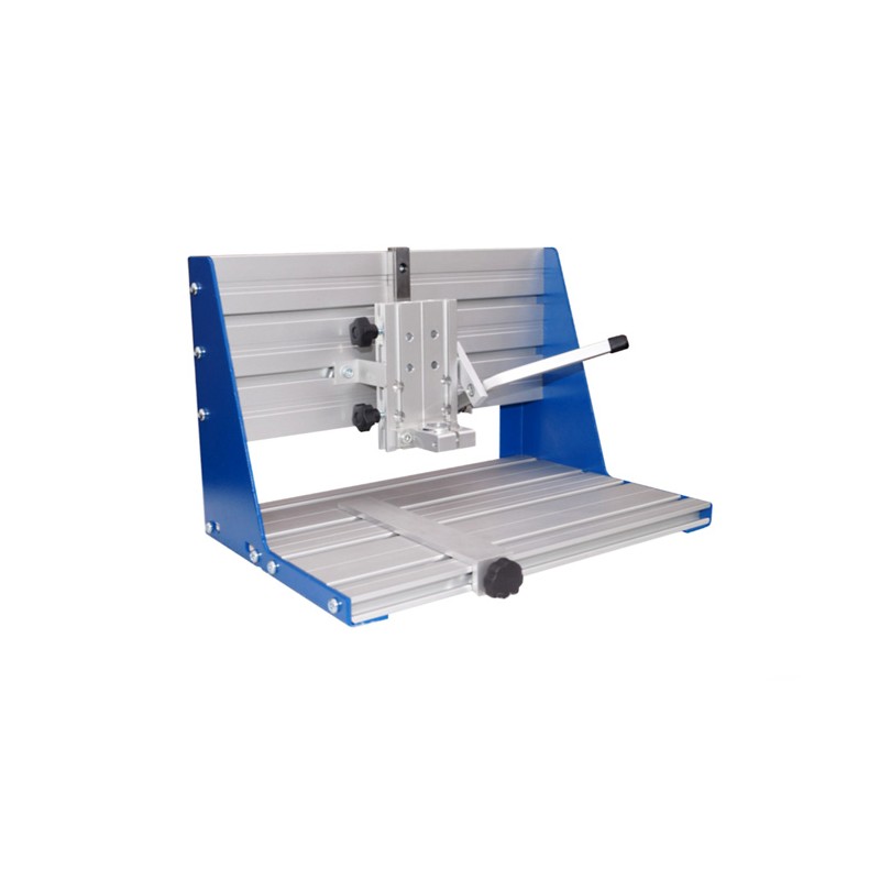 Universal Drilling and Routing Stand in a sturdy profile frame with aluminium side walls. These mounting frames have ergonomically shaped hand levers, as well as adjustable and lockable stops for height, depth and side limitation. We offer the 144002 type of this Gie-Tec series.