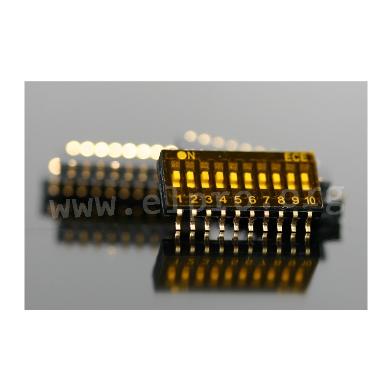 13319 SD 10 mini EHS110LT EHS110LT code switch, SMD version, 1.27mm pitch. • top tape sealed• pitch: 1.27mm• can be assembled by any automatic IC inserter• raised actuator• bottom epoxy sealed against flux immersion• switching capacity: 25mA/24V DC• transmission current: 100mA/50V DC• contact resistance, max.: 100mΩ• insulation resistance (100V DC), min.: 500MΩ• dielectric strength, min.: 300V DC/1min.• capacity of adjacent switch, max.: 5pF• spacing between rows: 8.9mm• insulation shell: UL94V-0, black• contact finish: gold over nickel• operating temperature: -25...+70°C• operating force, max.: 800g• switching capacity: 1000 operations• air humidity: 95% RH, 40°C/96h• vibration test: 10Hz-55Hz-10Hz/6h• by ECE