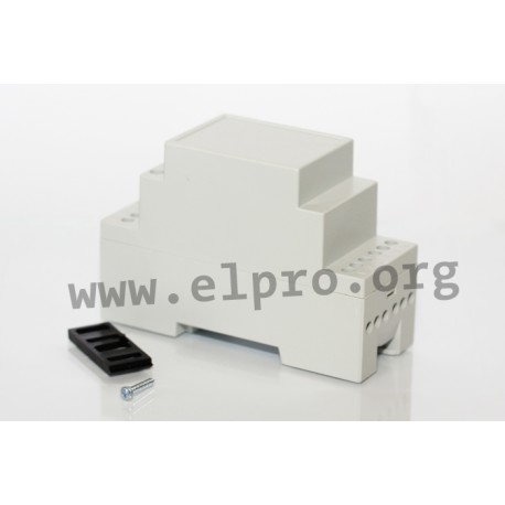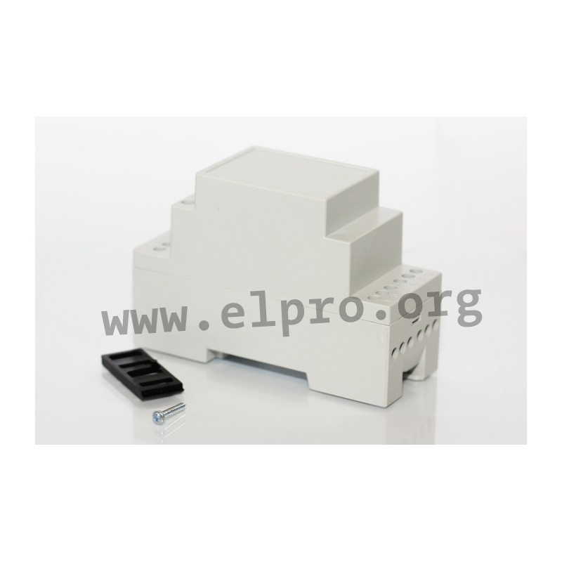 36868 MR 2CB MR2/CB/GREY MR2/CB/GREY DIN rail enclosures by Elbag. • ABS enclosure with snap-on mechanism for control cabinet mounting• for DIN-rails meeting DIN EN 50022• enclosure base and lid latch together and can be screwed together• connection of inputs and outputs via terminal blocks (P 5,08)• guide grooves for easy mounting of printed circuit boards• colour: light grey• closed