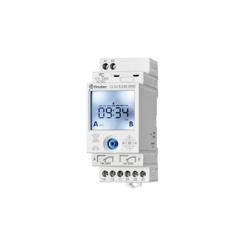 Time switches for daily or weekly time setting, with two changeover contacts (DPDT), and 16A. They are equipped with a internal battery (CR2032, 3V, 230mAh) for set-up and programming in the event of a power failure, easily replaceable from the front. We offer the 12.A2.8.230.0000 type of this Finder series.