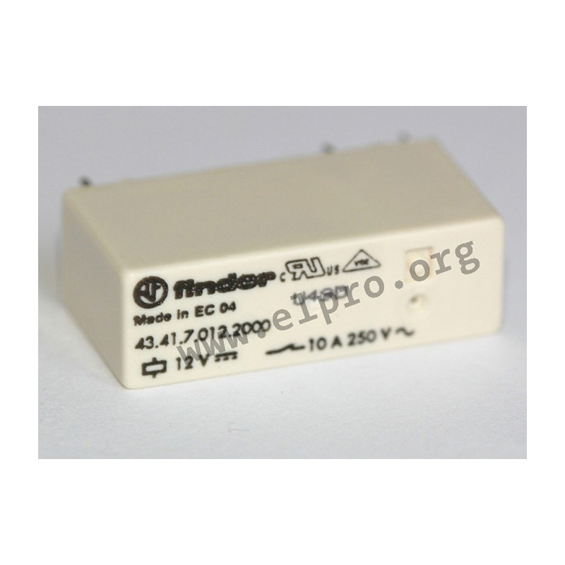 Relays in a 30,2x10,2x15,4mm housing with 10A and an SPDT contact. These devices comply with RTII (flux proof) and have a very low coil consumption (0,25W). They have a protective separation between coil and contacts according to VDE0160, EN50178, EN60204 as well as EN60335 and a sensitive DC coil. We offer the following types of this Finder series: 43.41.7.012.2000, 43.41.7.012.0000, 43.41.7.024.2000, 43.41.7.024.0000, 43.41.7.012.4000 and 43.41.7.024.4000.