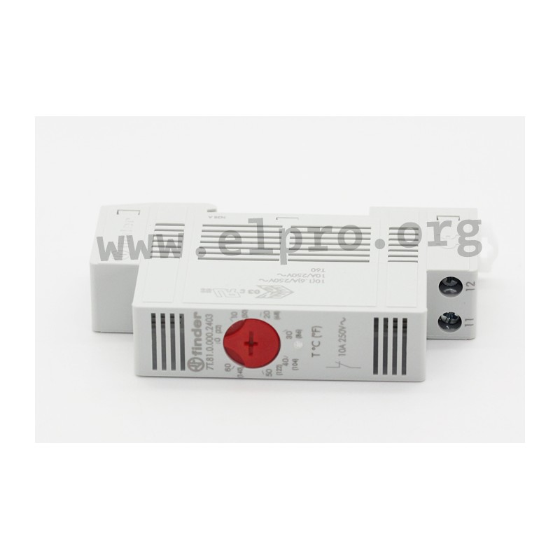 Temperature controllers for mounting in switch cabinets in a compact size and with snap action thermostatic bimetal sensor. These thermostates are independent from the power supply, have a wide temperature setting range, and a long electrical life. We offer the following types of this Finder series: 7T.81.0.000.2303 and 7T.81.0.000.2403.